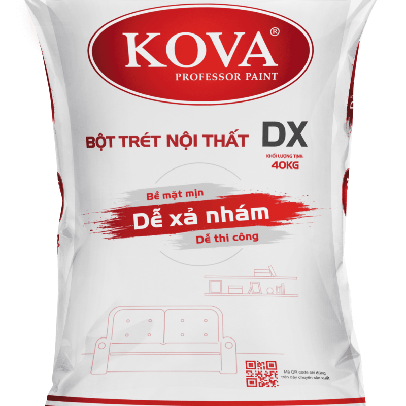 Bột trét nội thất KOVA DX là loại bột trét được thiết kế để làm phẳng tường trong nhà che lấp các khiếm khuyết trước khi sơn phủ, đã được nhiệt đới hóa hoàn toàn, phù hợp với hầu hết các loại công trình xây dựng