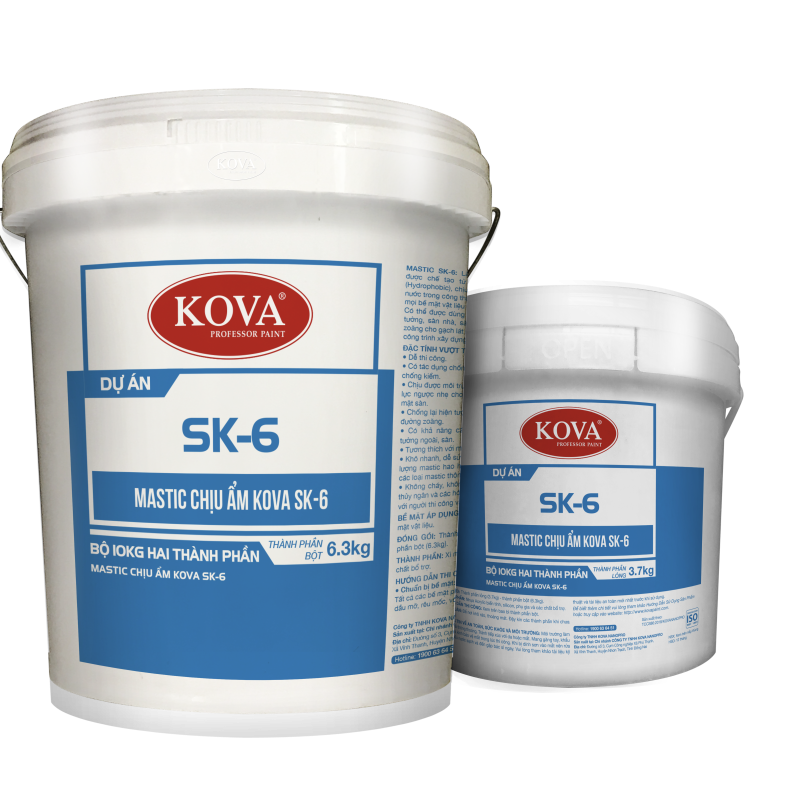 Mastic chịu ẩm KOVA SK6 là loại mastic 2 thành phần được chế tạo từ những Monomer kỵ nước (Hydrophobic), chịu được ẩm ướt nhờ có tính kỵ nước trong công thức phân tử. Bám dính tốt trên mọi bề mặt vật liệu bê tông, xi măng, gạch… Có thể được dùng để phủ lên tường xây, chân tường, sàn nhà, sàn sân hoặc làm hồ để chà zoăng cho gạch lát sàn, ứng dụng cho tất cả các công trình xây dựng dân dụng và công nghiệp