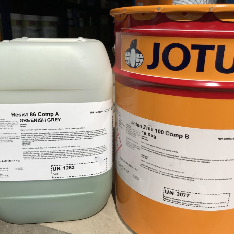 Đóng gói: Resist 86 Comp A 8 phần + Jotun Zinc 100 Comp B 2.6 phần (10.6L/bộ).
