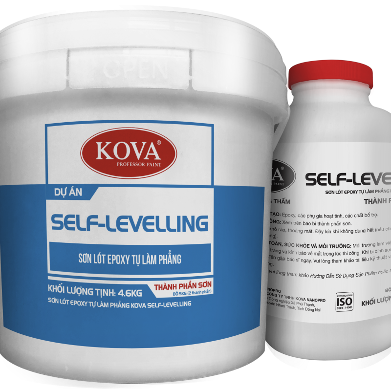 Sơn lót Epoxy tự làm phẳng KOVA SELF-LEVELING MÀU NHẠT là sơn lót hệ nước 2 thành phần mang nhiều đặc tính vật lý vượt trội, dùng để làm phẳng sàn trước khi phủ sơn công nghiệp EPOXY KOVA KL-5 sàn, Sơn công nghiệp epoxy KOVA Solvent Free. Ứng dụng cho sàn nhà xưởng, bệnh viện, kho dược, nhà máy thực phẩm, bãi đậu xe, nhà đậu máy bay, tầng hầm, sân vận động, hồ bơi.