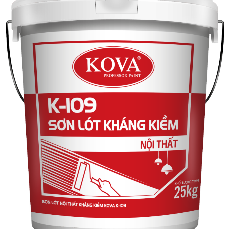 SƠN LÓT NỘI THẤT KHÁNG KIỀM KOVA K-109 là sơn hệ nước, trên cơ sở chất tạo màng Styrene Acrylic. Sơn có độ bám dính tốt. Cùng với các thành phần hóa học đặc biệt, giúp kháng lại hàm lượng kiềm trong vôi tự do của xi măng. K–109 được dùng làm sơn lót kháng kiềm nhằm bảo vệ và giảm tiêu hao cho lớp sơn phủ trang trí.