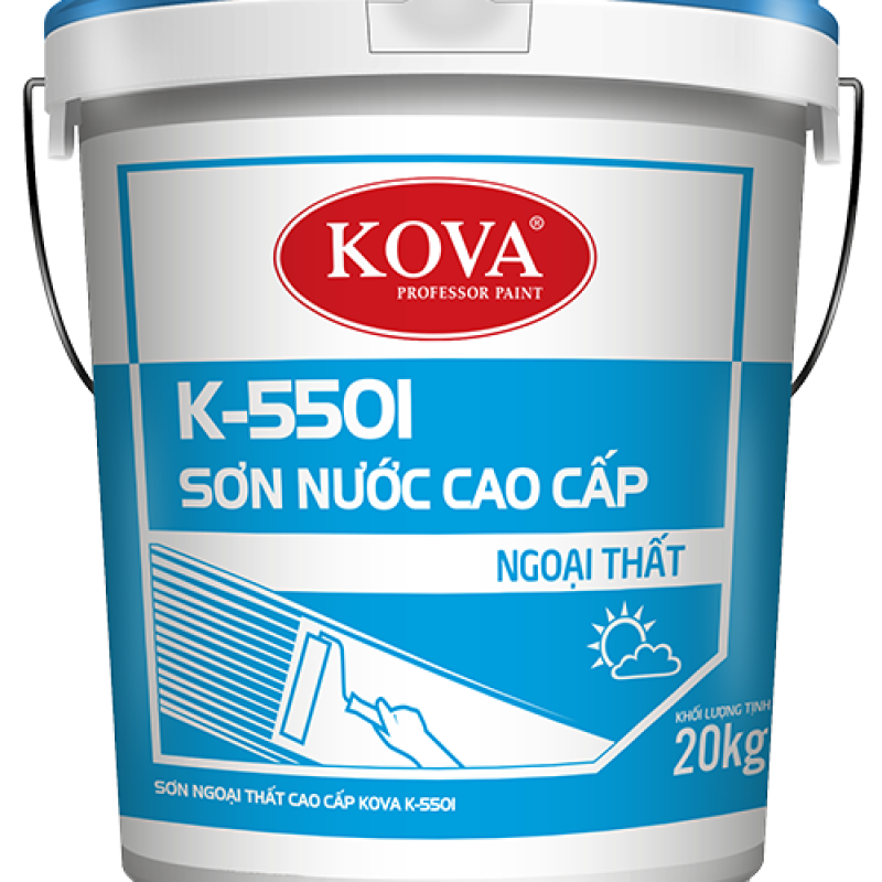 SƠN NGOẠI THẤT CAO CẤP KOVA K-5501 là loại sơn cao cấp hệ Pure Acrylic phủ ngoại thất, đã hoàn toàn nhiệt đới hóa, rất phù hợp với khí hậu nóng ẩm của Việt Nam. Dùng để chống thấm và trang trí ngoại thất của tường bê tông, vữa, xi măng sau khi đã dùng mastic dẻo, bột trét để làm phẳng và được phủ sơn lót ngoại thất kháng kiềm, hoặc thi công trực tiếp lên CT-11A Plus Tường.