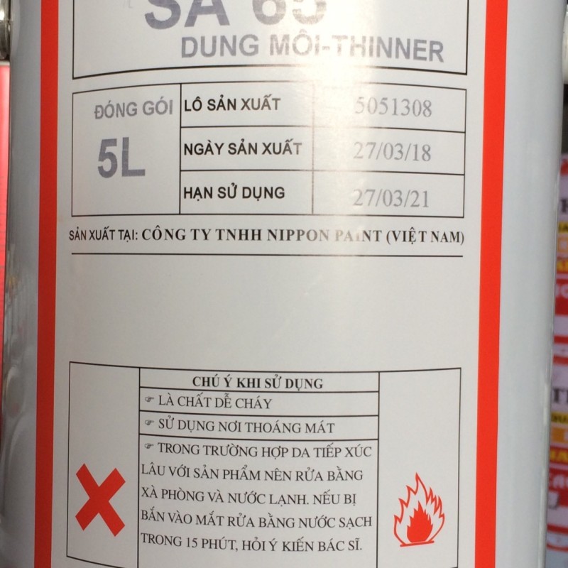 Thinner Nippon SA65 là dung môi được dùng để pha loãng sơn Epoxy Nippon như EA4/ EP4/ EA9, EA9 White Primer/ EA9 Red Oxide Primer, EP4 Clear Sealer theo tỉ lệ 10% thể tích sơn.
