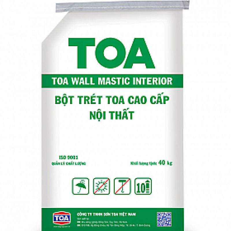 Bột trét TOA Wall Mastic interior là bột trét (bột bả) tường nội thất dùng cho các bề mặt như: tường xi măng, trần nhà, bê tông và các bề mặt cần xử lý trước khi sơn lót hoặc sơn phủ. Thích hợp cho mọi loại sơn nước ngoại thất. Không bong tróc, nứt nẻ. Bền vững với thời gian, chịu đựng mọi thời tiết.